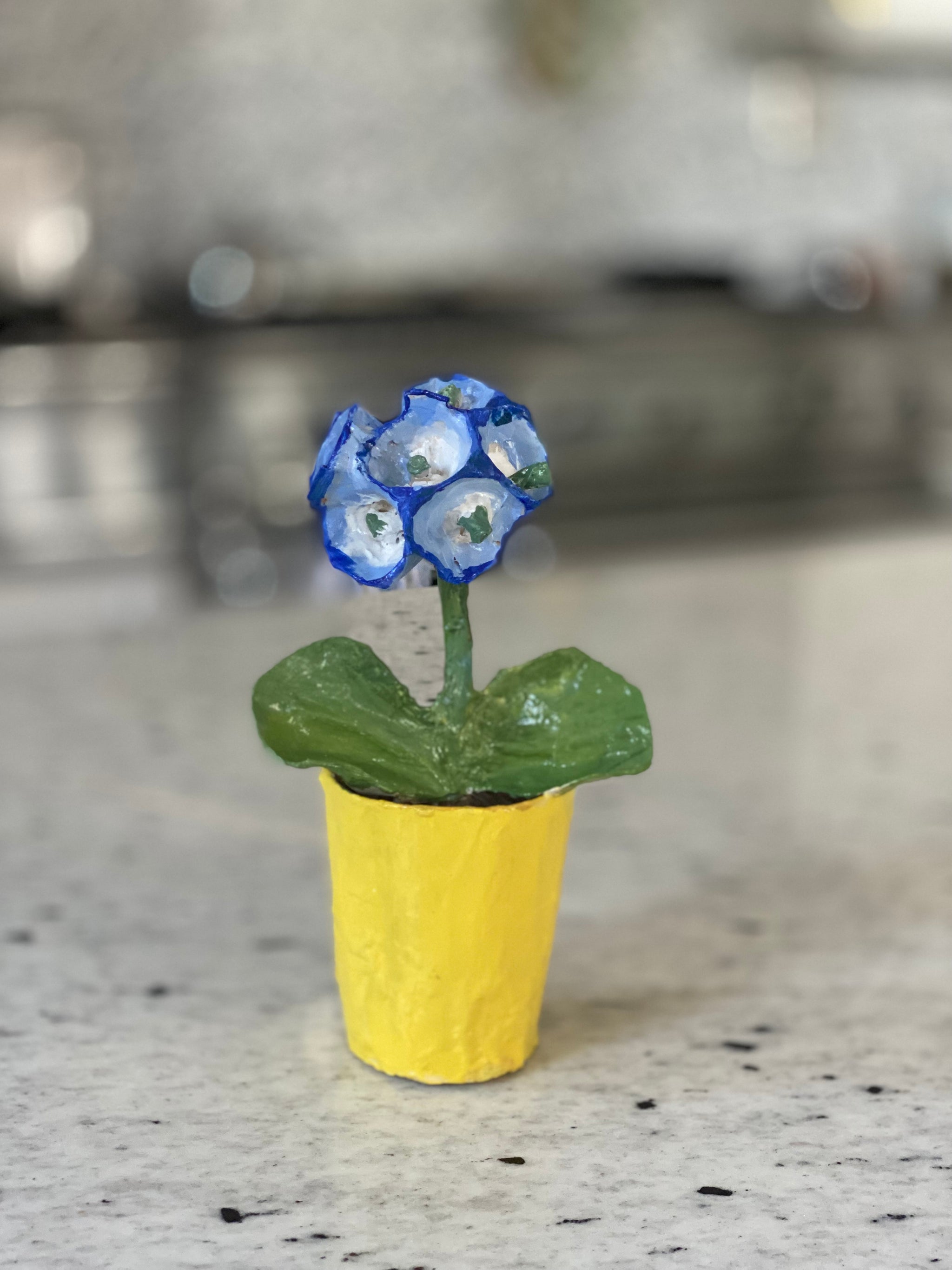 Hand sculpted papier mache art piece. Pretty primula in vibrant pot.