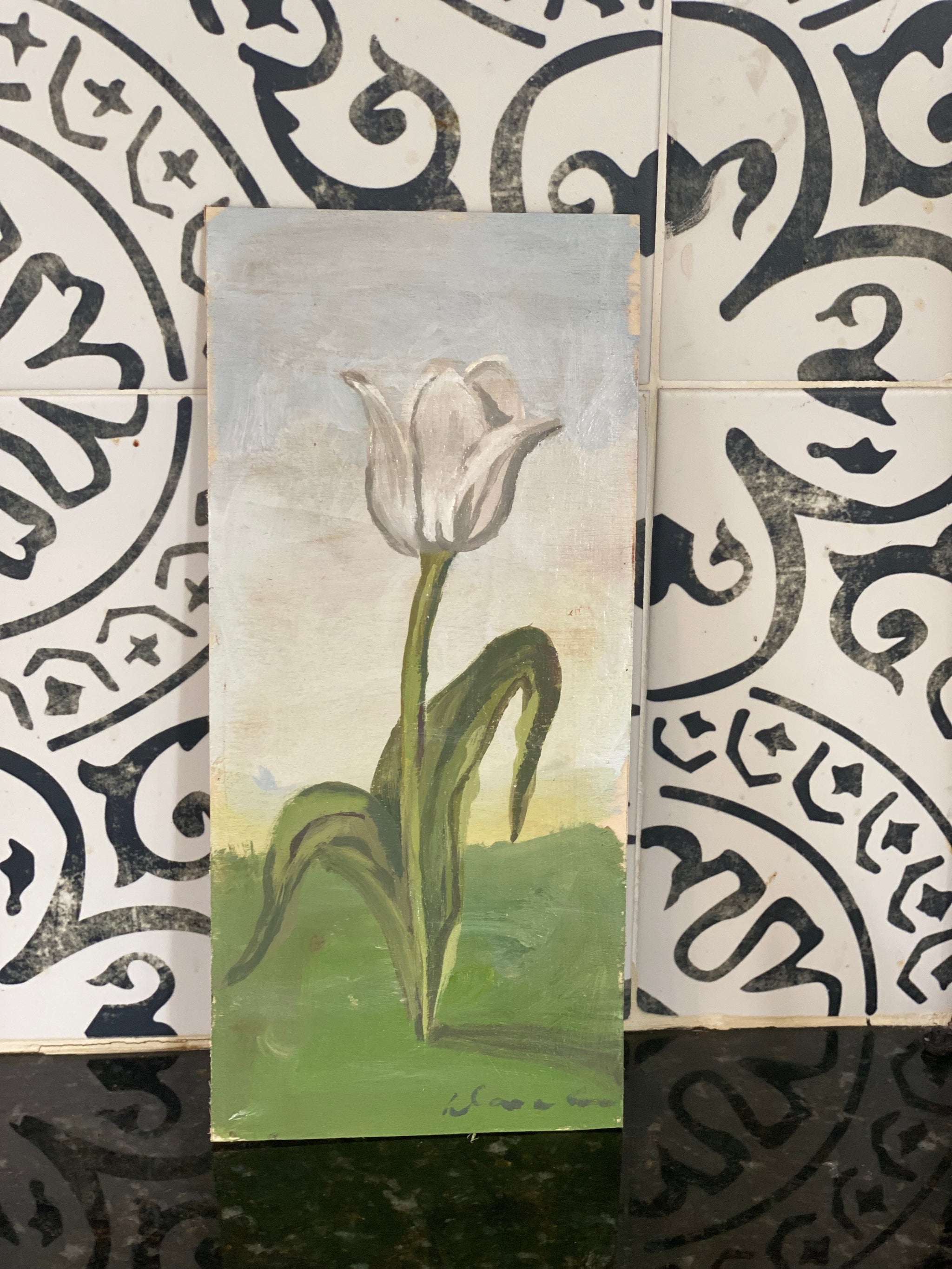 This is an ethereal painting by Dana Gibson. A study of a white Tulip. Painted on gessoed wood panel. This quick study is a charming shape and great accent.